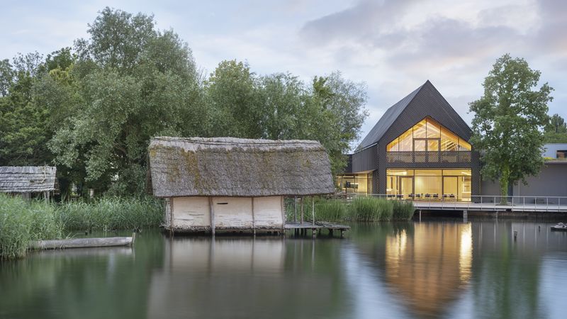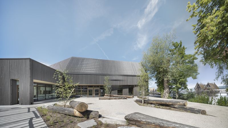 Mit der Erweiterung rüstet sich das 1922 gegründete Museum für die Zukunft. „In der heutigen Zeit ist es wichtig, den Gästen bei der Geschichtsvermittlung ein attraktives und verständliches Erlebnis zu bieten und sich immer wieder, auch in Anbetracht der digitalen Konkurrenz, zu überlegen, mit welchen Mitteln dies optimal erreicht werden kann“, erklärt Prof. Dr. Gunter Schöbel. Seit über 100 Jahren bietet das Museum Einblicke in 3.000 Jahre Menschheitsgeschichte. Im Freilichtbereich lassen sich 23 der Stein- und Bronzezeit nachempfundene Pfahlbauten besichtigen. Der Neubau beherbergt nun ein modernes Besucherzentrum und eine neue Ausstellung zum UNESCO-Weltkulturerbe der Pfahlbauten. Die originalen Reste der Pfahlbauten befinden sich nur wenige Meter vom Museum entfernt unter Wasser. Hervorgegangen ist der Entwurf von a+r Architekten aus einem Wettbewerb im Jahr 2018, den die Stuttgarter mit dem 1. Platz für sich entscheiden konnten.