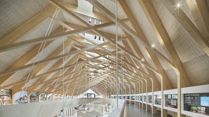 a+r Architekten erweitern am Bodensee das renommierte Pfahlbaumuseum um eine attraktive Ausstellungshalle in Holzbauweise. Blickfänger des Holzbaus mit fast 1.300 Quadratmeter Nutzfläche ist sein offener Dachstuhl mit einer expressiven unterspannten Rahmenkonstruktion aus Brettschichtholz.
