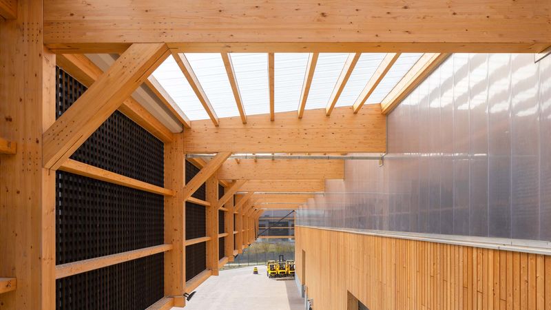 Nachhaltigkeit und Energieeffizienz spielen bei diesem Gewerbebau auch bei der Haustechnik eine wichtige Rolle. Ein Blockheizkraftwerk versorgt die Fußbodenheizung im Werksgebäude sowie den Büroteil mit kostengünstiger Wärme, außerdem deckt es einen Großteil des Strombedarfs des Gebäude, das nach Niedrigenergiestandard gedämmt ist. Im Sommer sorgt die Absorptionskältemaschine für ein angenehm kühles Klima in den Räumen. Ein großer Teil der Dachfläche wurde als extensives Gründach bepflanzt, das Vögeln und Insekten als Lebensraum dient und den Mitarbeitenden auf der angrenzenden Dachterrasse zur Erholung zur Verfügung steht. Die Frischluftzufuhr erfolgt über manuell zu öffnende Fenster. Darüber hinaus tragen die feuchtigkeitsabsorbierenden Holzoberflächen der Konstruktion zur natürlichen Klimatisierung der Raumluft bei.