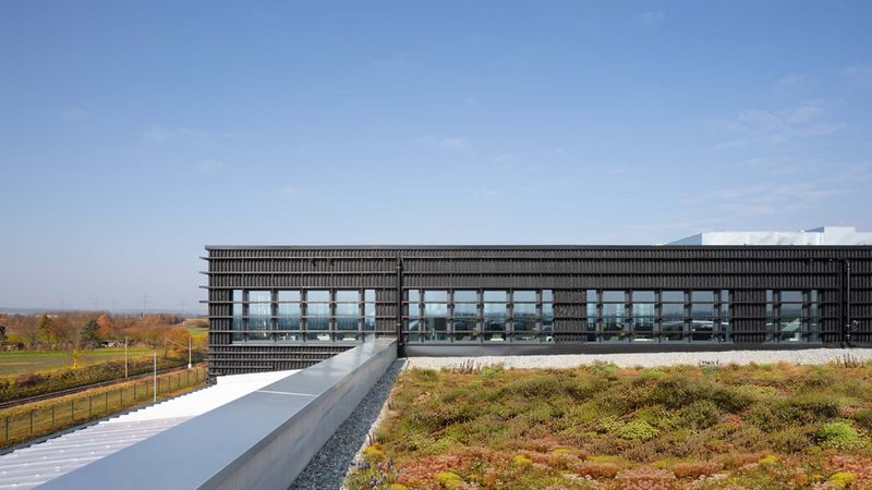 In einem gewöhnlichen Gewerbegebiet südlich von Stuttgart haben rundzwei Architekten eine ungewöhnliche Firmenzentrale und Betriebsstätte in Holzbauweise realisiert. Das lichtdurchlässige, umlaufende Vordach aus karbonisiertem Lärchenholz – der namensgebende "Holzhut" – schützt vor Witterung und gibt dem Gebäude seine charakteristische Form.