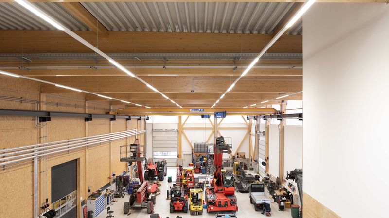 Hald & Grunewald ist auf den Verkauf und die Vermietung von Gabelstaplern, Teleskopstaplern, Arbeitsbühnen und Containerlösungen spezialisiert. Schulungen, Wartung und Reparaturen gehören ebenfalls zum Angebot. Am neuen Hauptstandort in Ergenzingen, zwischen Schönbuch, Nordschwarzwald und Schwäbischer Alb, arbeiten rund 90 Mitarbeiter:innen. Ziel des Neubauprojekts war es, alle Funktionen des Unternehmens an einem Standort zu bündeln. Zu Projektbeginn analysierten und optimierten die Architekt:innen gemeinsam mit den Mitarbeitenden die bestehenden Arbeitsabläufe. Es galt, das alteingesessene Familienunternehmen "neu zu denken", alte Strukturen zu hinterfragen und einen zeitgemäßen Gewerbebau mit optimalen Workflows und Aufenthaltsqualität für alle Nutzergruppen zu schaffen.
